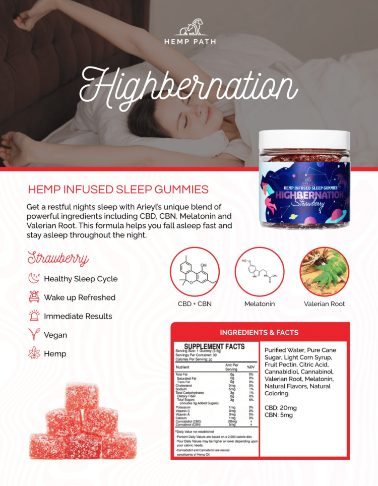 Say goodbye to restless nights, and hello to the best sleep of your life! Arieyl's hemp-infused sleep gummies are packed with a powerful blend of CBD, CBN, Melatonin, and Valerian Root to help you fall asleep faster and sleep longer.